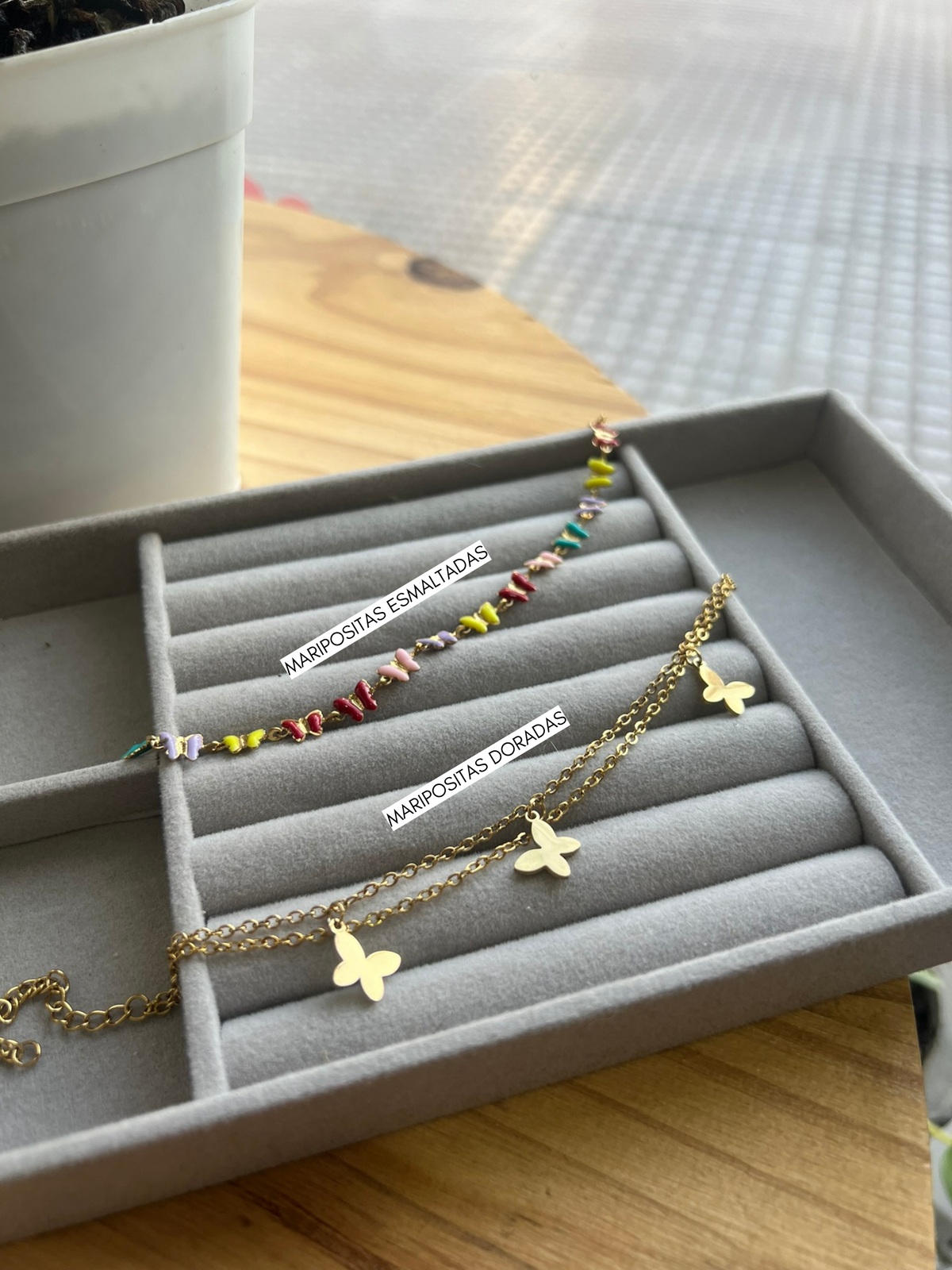 Delicadas y con estilo propio, estas pulseras unen lo mejor de dos mundos 🌈🦋: una llena de color con pequeñas mariposas esmaltadas, y otra más clásica en acero dorado con dijes de mariposa colgantes. Ligeras, cómodas y ajustables, son el complemento ideal para sumar frescura y un detalle único a cualquier look.